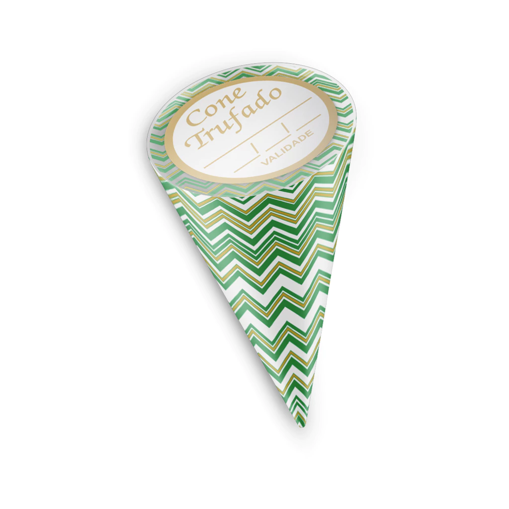 A Embalagem para Cone Trufado Metalizada da Lumipel é ideal para quem busca proteger e valorizar seus cones trufados, mantendo o sabor e a crocância por mais tempo. Com a estampa Chevron Verde, ela traz um visual moderno e vibrante, perfeito para destacar seu produto.